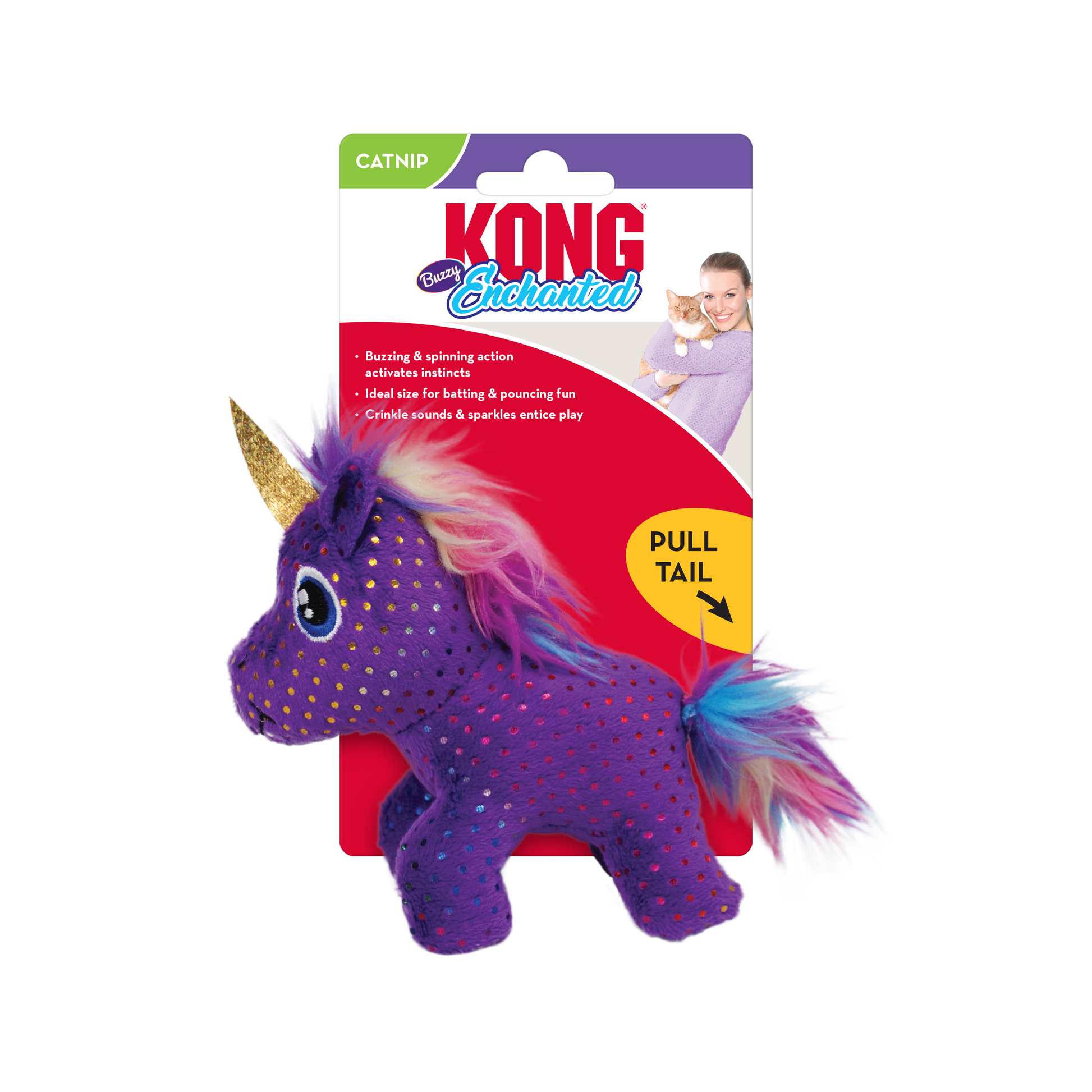 The KONG Enchanted Buzzy toy lures cats with an irresistible buzzing motion that engages natural instincts. Buzzing and spinning begin when the unicorn’s tail is pulled, activating a cat’s natural catch and capture play desires. Extending the fun are crinkle sounds, sparkly colours and KONG Premium Catnip, all adding up to keeping kitty’s occupied for some magical playtime fun.