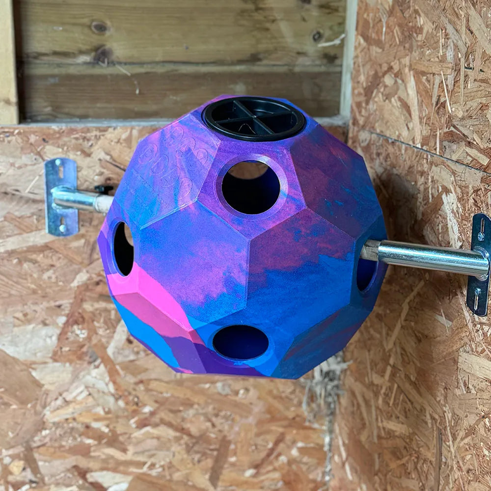 Hay Play Spinner is a kit with two brackets and a wooden pole allowing you to mount your hay play to a wall. The design enables the hay play to be removed / refilled and re-positioned.