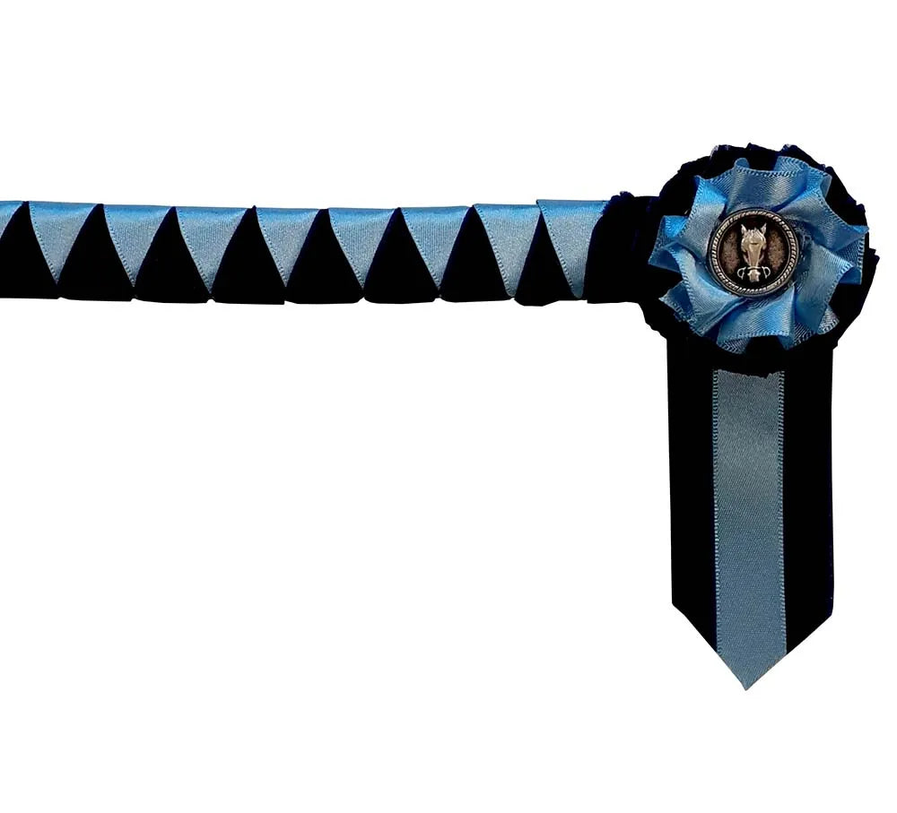 3/4" Leather browband with velvet and satin ribbon with flag and 2 layer rosette horse head stud.