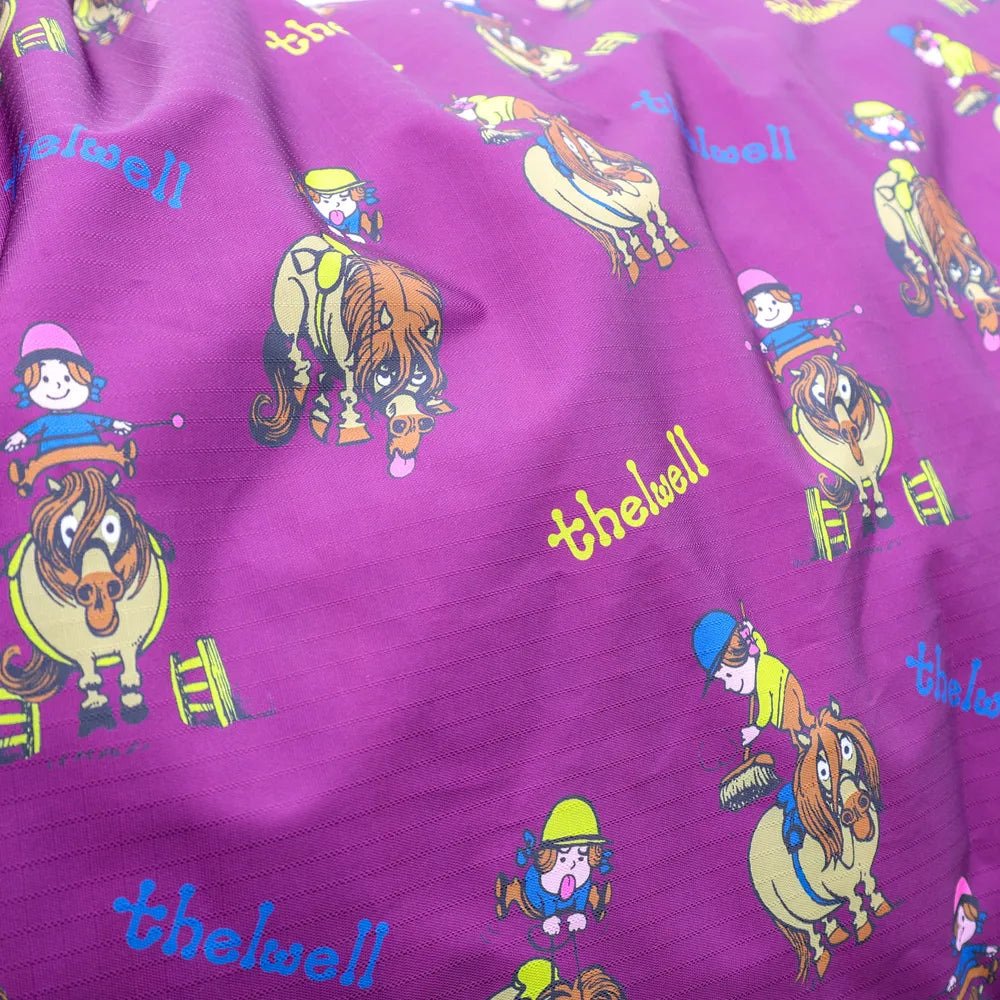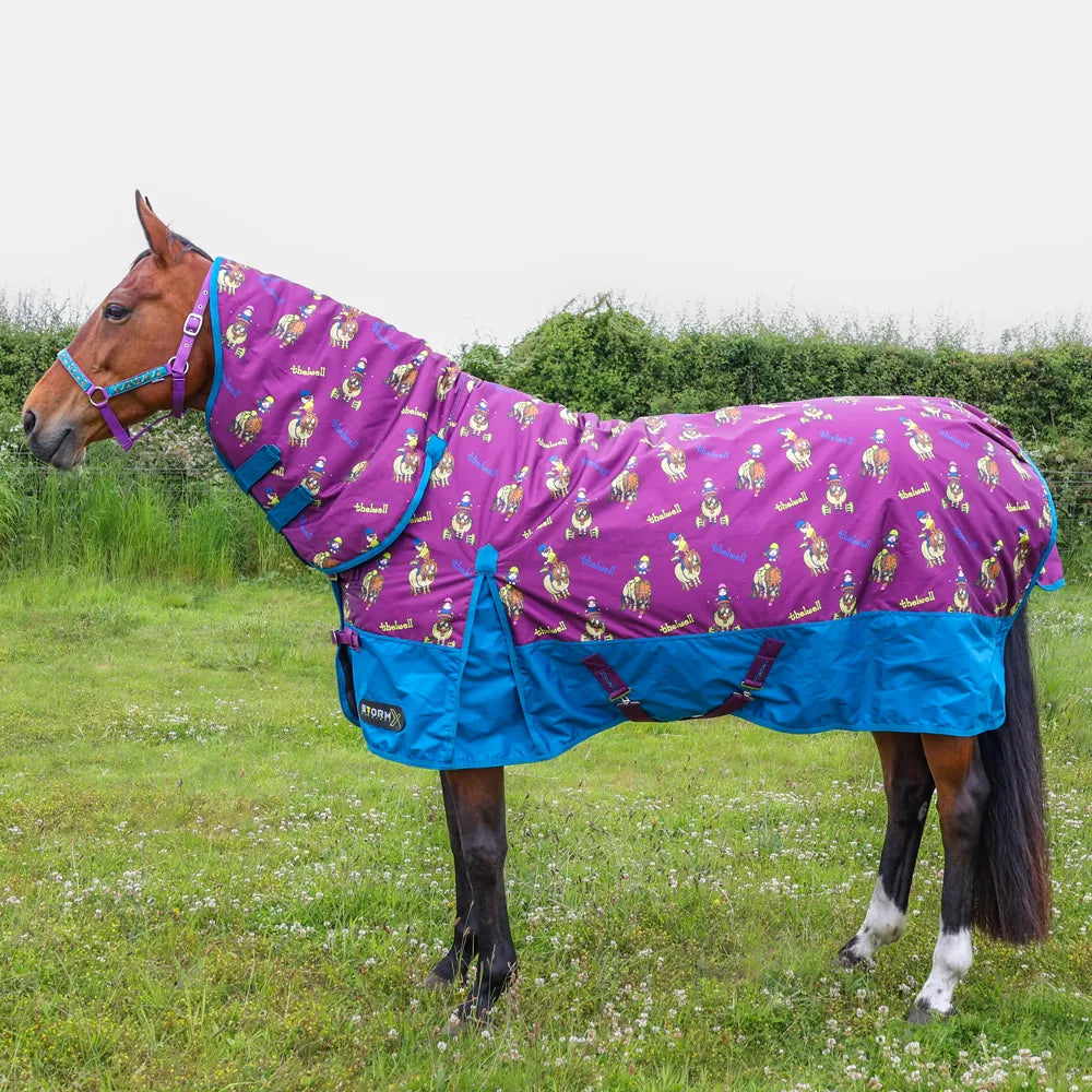This stunning mediumweight turnout rug from the StormX Original range is the perfect addition to your horse’s wardrobe! Covered in Thelwell cartoons, this attractive Imperial Purple rug has a Pacific Blue drip strip and subtle coordinating trim and accessories. Featuring a 600 denier waterproof and ripstop outer material, this rug has a 200g fill, perfect for when a heavier layer is required. The integrated contour neck cover means optimum protection and warmth for your horse. Finished with shoulder gusset, adjustable twin buckle chest fastenings, adjustable leg straps and surcingle's and tail flap for extra protection, security and comfort.