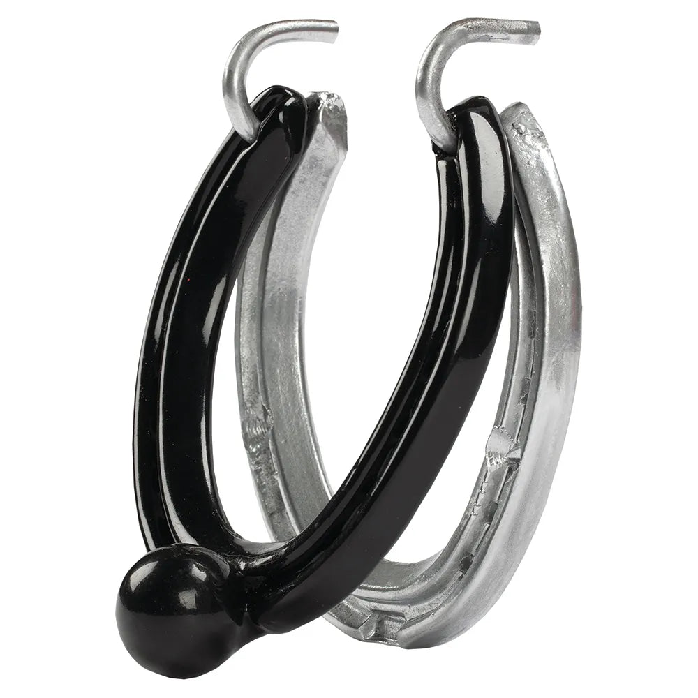 How can any real horse enthusiast resist such a atmospheric, stylish and really practical door knocker? Ideal for the house, tackroom, saddlers shop and a perfect present. Deep clunking sound. Genuine horse shoes with solid wrought iron ball gives an impressive feel. Presented for sale with our new header card system for suspended display. Solid steel horse shoes, one is bright zinc plated, the other is stubbyfine coated in black.