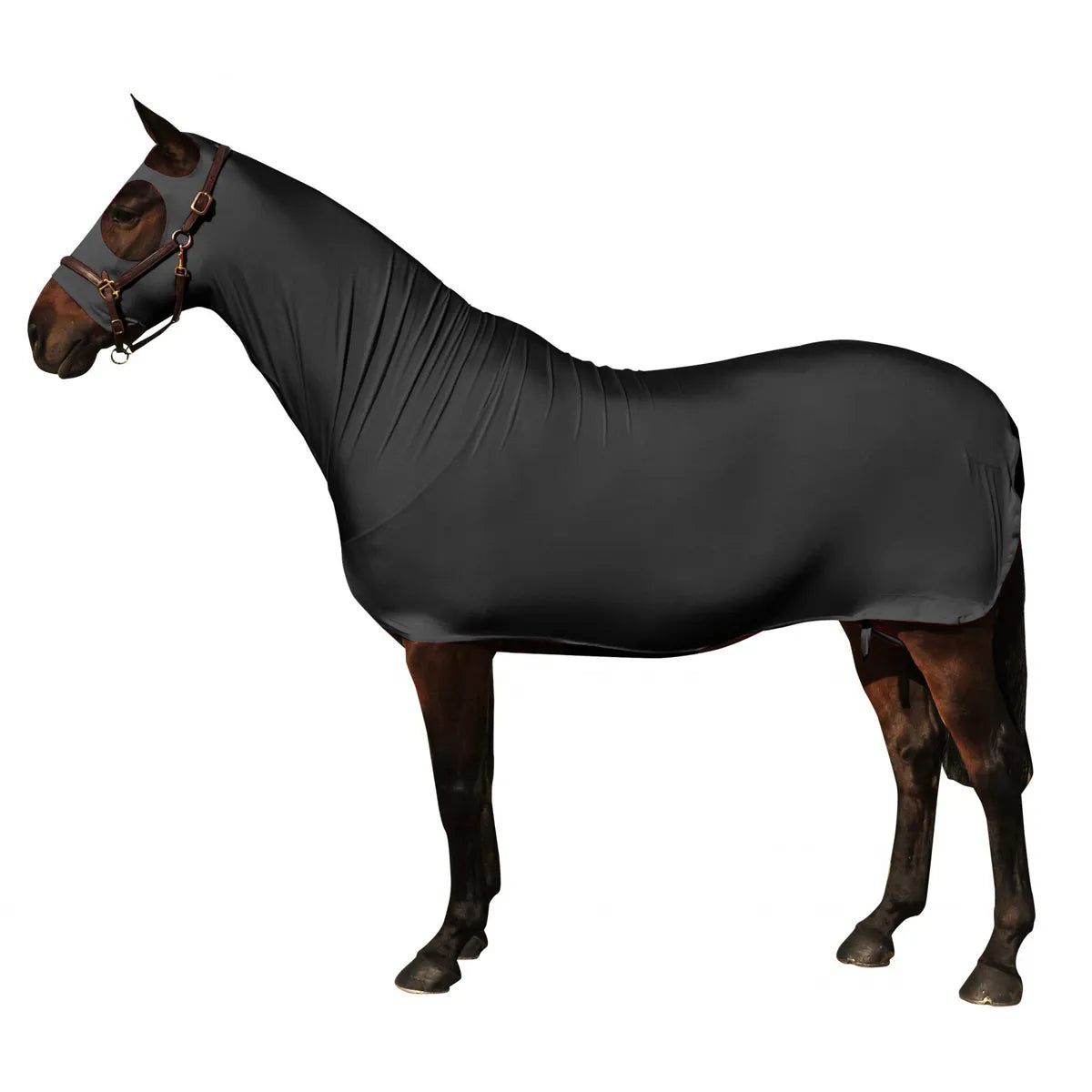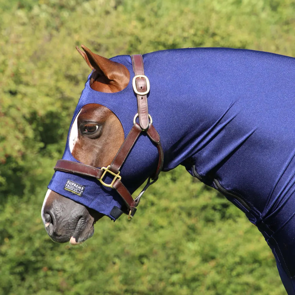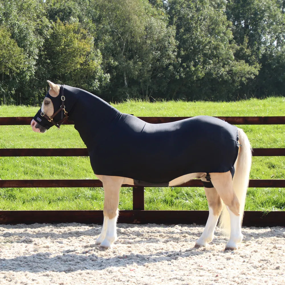 The SUPREME PRODUCTS® Body Wrap, made from the finest grade 4 way stretch Lycra mix, is a superb garment for aiding in preparation by laying the coat, adding condition and shine and keeping plaits intact and pristine. This garment can be used whilst travelling and also stabling, in place of duvets or as a lightweight rug. It should be close fitting, but not tight. It has a 12" underbelly strap and leg straps to hold it securely and comfortably. We recommend finishing off with a fillet string.