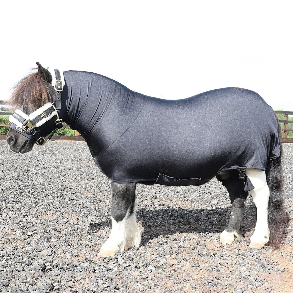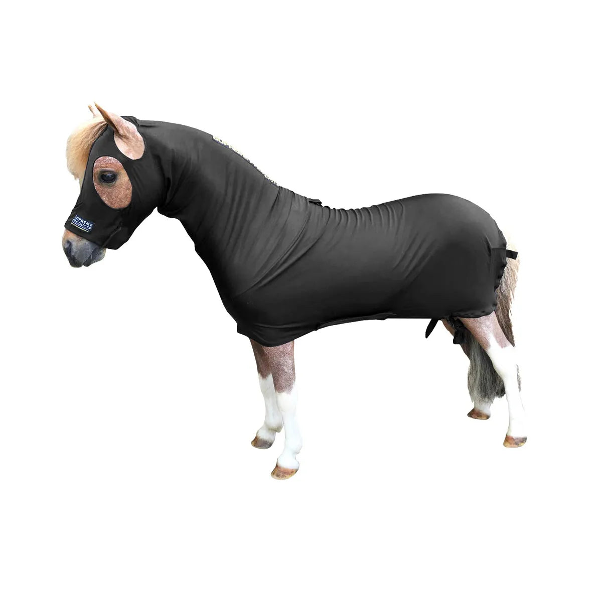 The SUPREME PRODUCTS® Body Wrap, made from the finest grade 4 way stretch Lycra mix, is a superb garment for aiding in preparation by laying the coat, adding condition and shine and keeping plaits intact and pristine. This garment can be used whilst travelling and also stabling, in place of duvets or as a lightweight rug. It should be close fitting, but not tight. It has a 12" underbelly strap and leg straps to hold it securely and comfortably. We recommend finishing off with a fillet string. These Body Wraps have been designed specifically with miniature horses in mind - with a revised head catering for the features and additional length in the neck. Fitted correctly, there will be no pulling or rubbing.